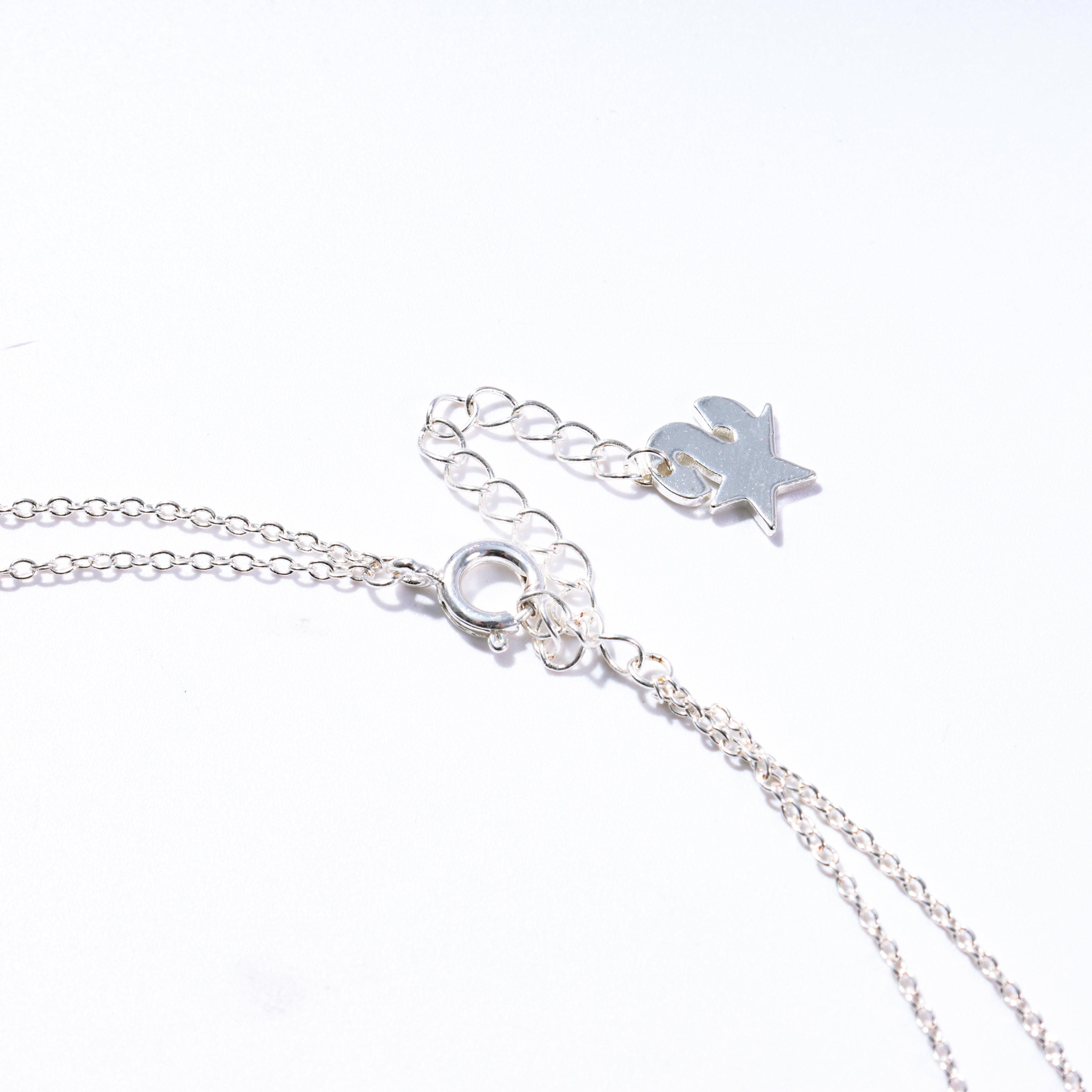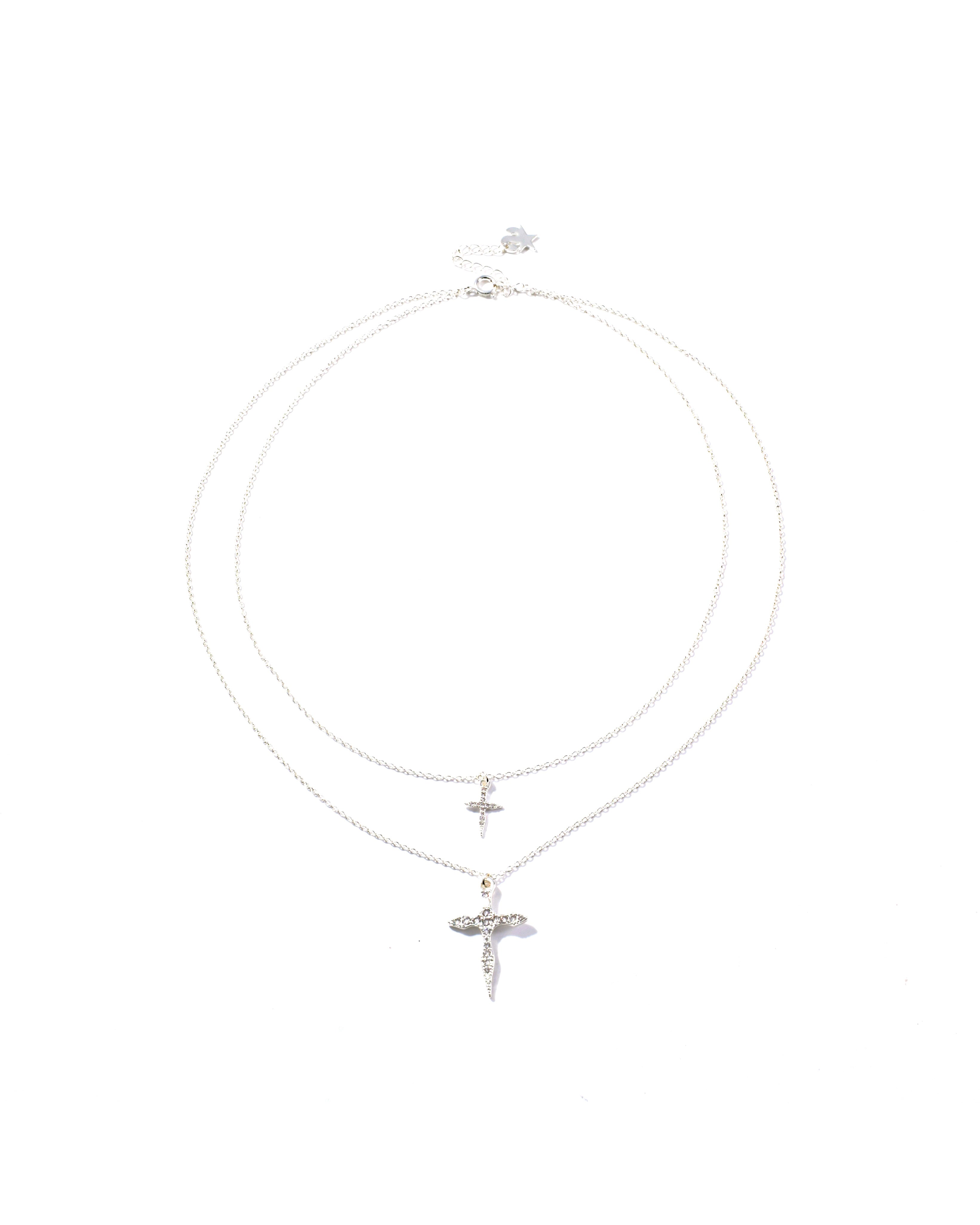 Doppia collana con pendente a croce irregolare tempestata di zirconi. Realizzata  con doppia placcatura argento. Dettaglio ciondolo con iconica S del brand.