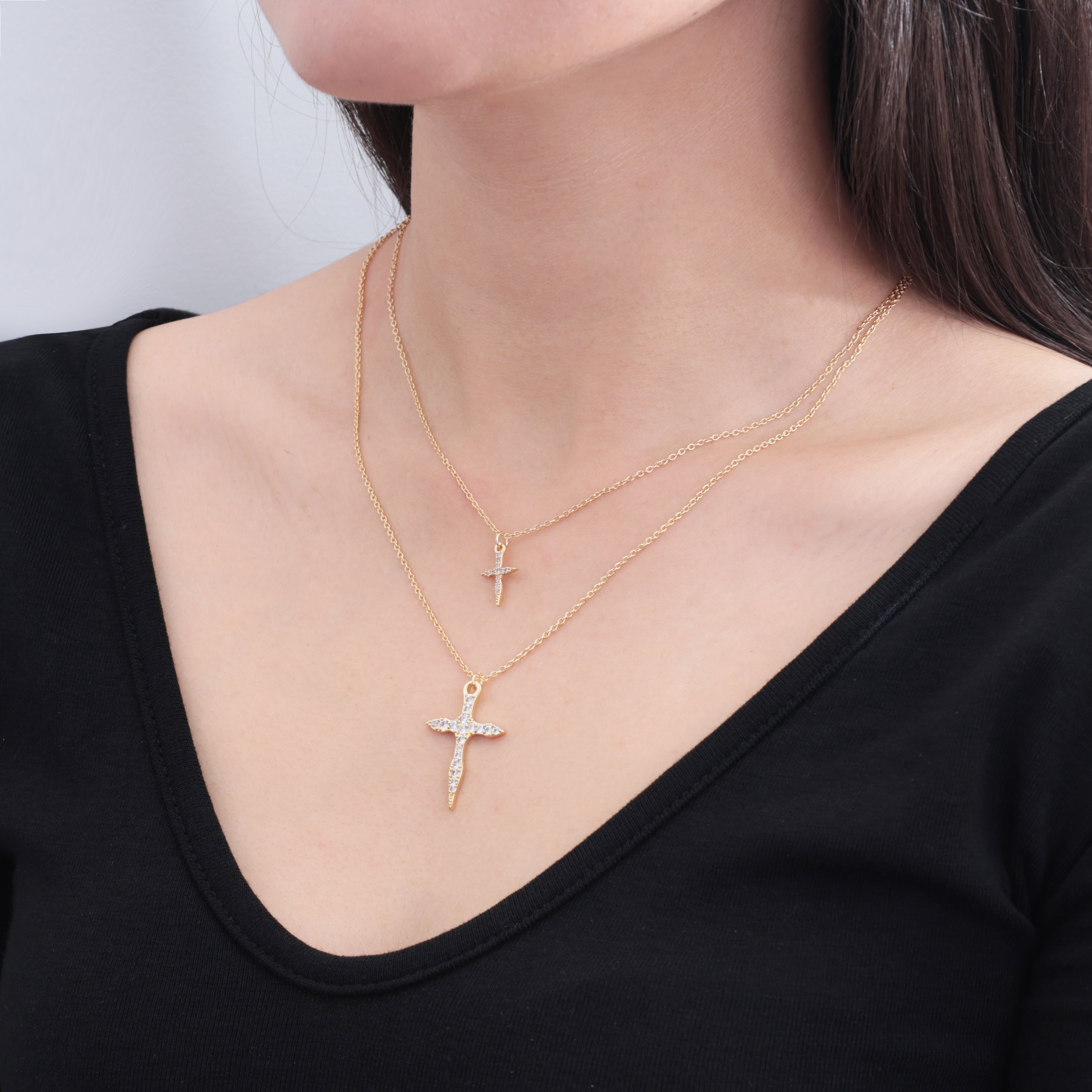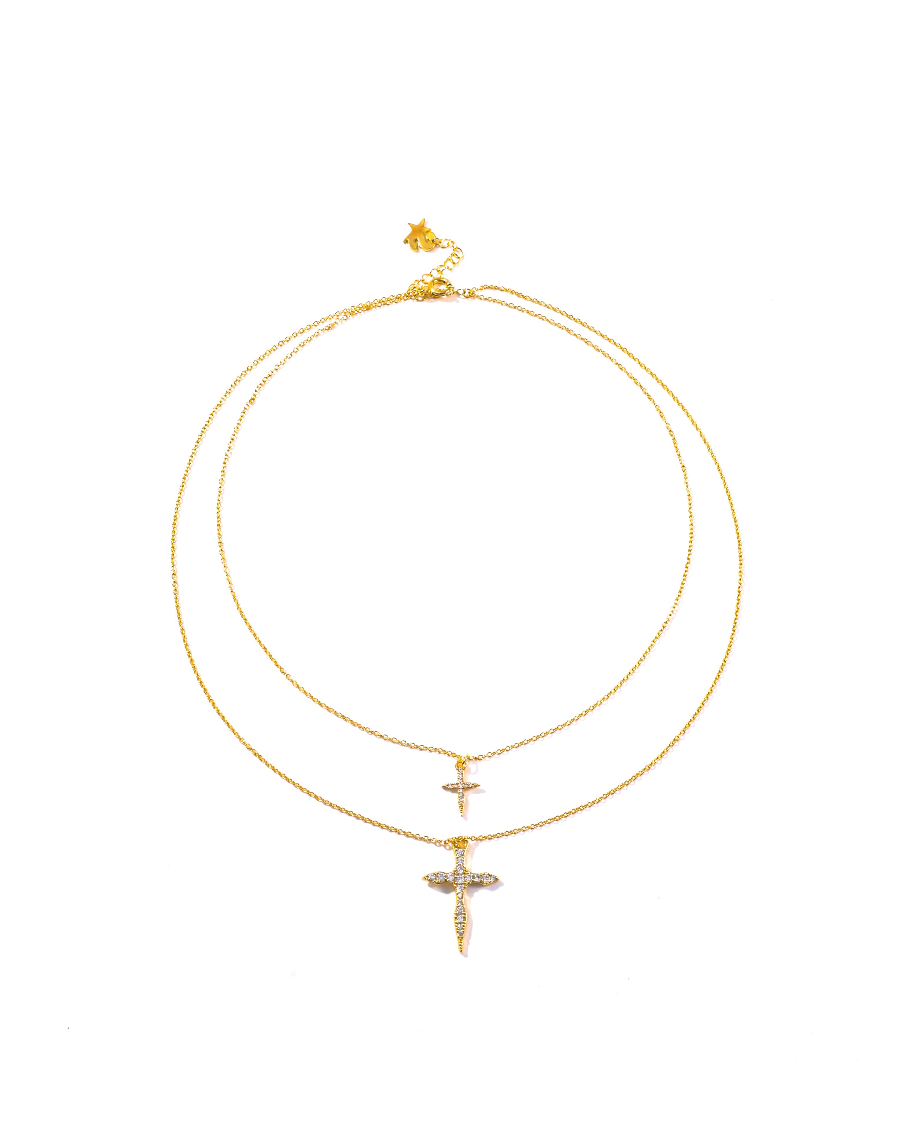Doppia collana con pendente a croce irregolare tempestata di zirconi. Realizzata con doppia placcatura oro. Dettaglio ciondolo con iconica S del brand.