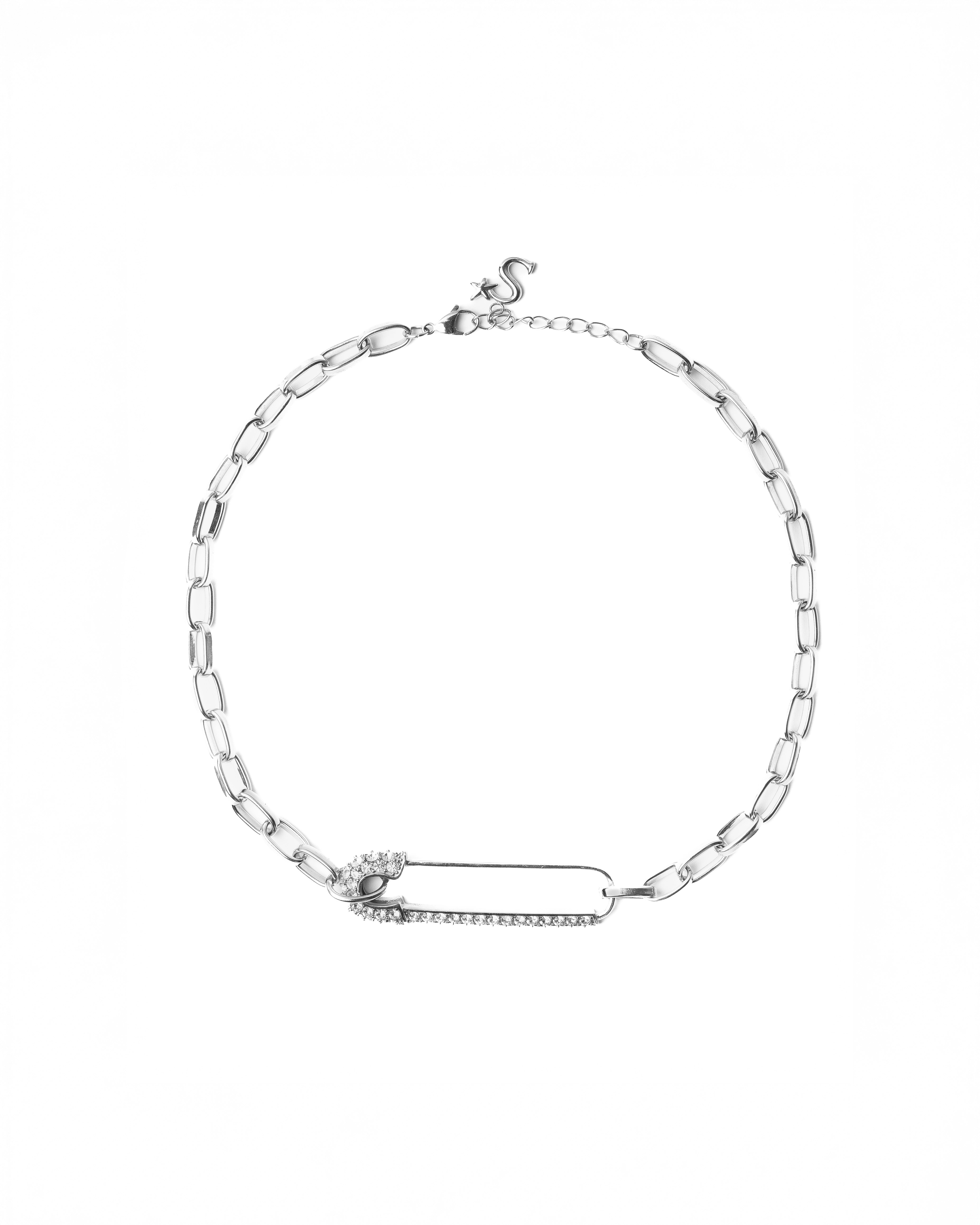 Collana in acciaio inossidabile con doppia placcatura argento e spilla in zirconi – regolabile 40-45 cm